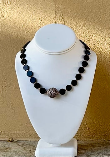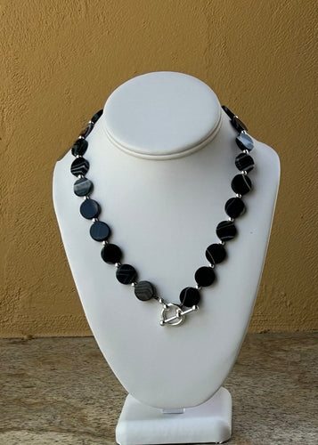 Necklace - round disk shape onyx, sterling silver beads and a chunky toggle