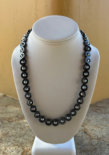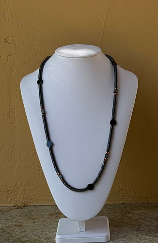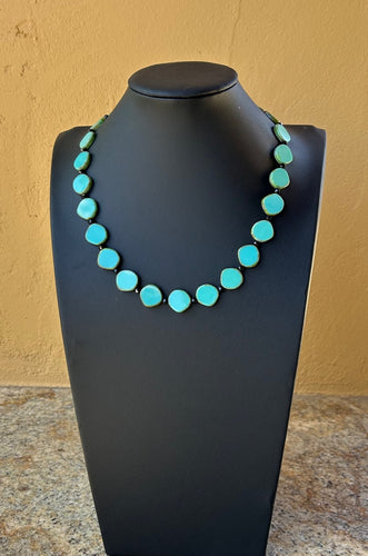 Necklace - 19" coin shape teal Czech glass and black spinel