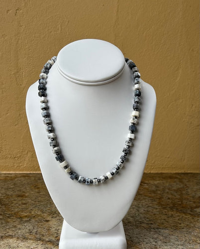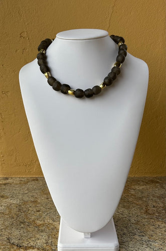 Necklace - 19" grey recycled glass with gold beads and 14K gold filled toggle