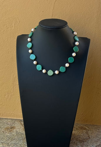 Necklace - Teal Czech glass, black spinel and white fresh water pearls