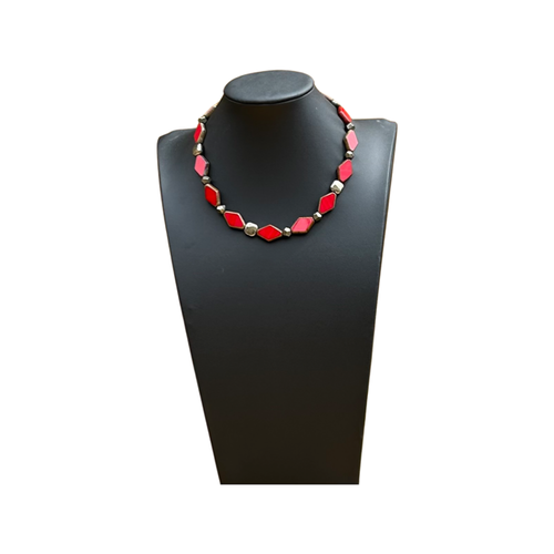 Necklace - Diamond shape red Czech glass necklace with metal spacers