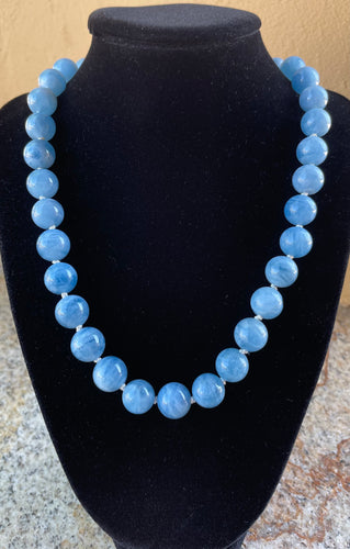 Necklace - 18" - Knotted 12mm round aquamarine beads with Swarovski crystal clasp
