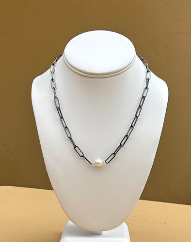 Necklace - Black paper clip necklace with a large (9mm) white round pearl