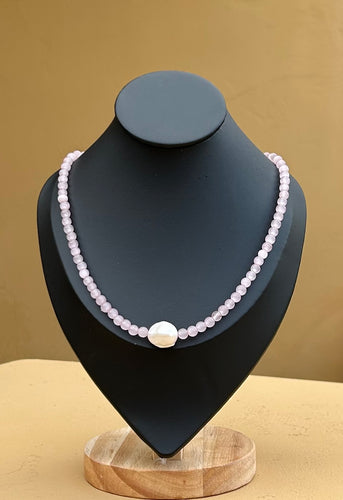 necklace - Pink cat's eye with a large (15mm) white baroque pearl and push clasp