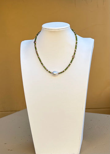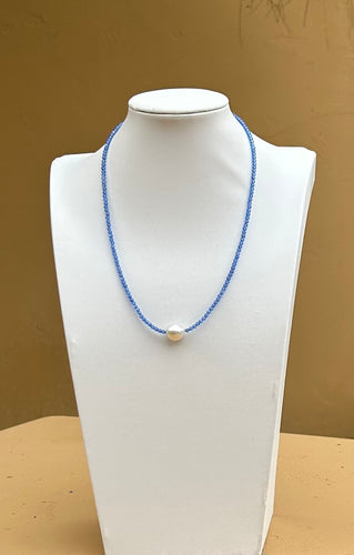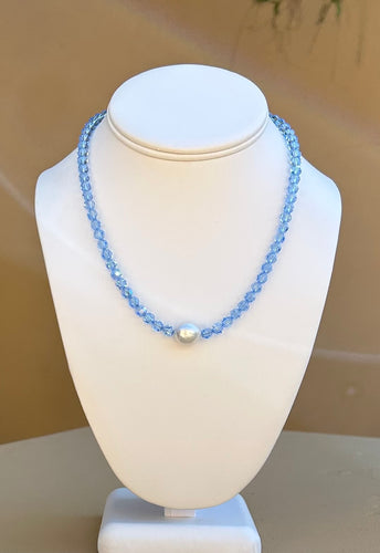 Necklace - 17" light blue sapphire Swarovski round crystal beads and a large white pearl