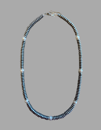 Necklace - Silver coated hematite with white round fresh water pearls