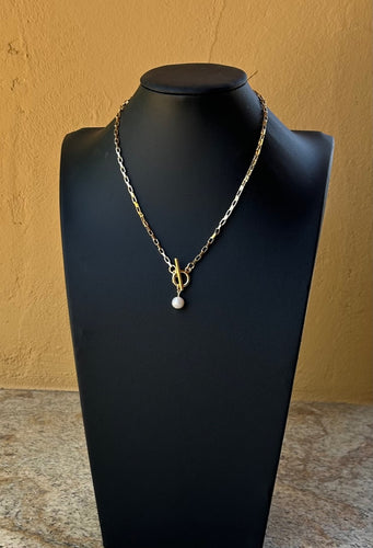 Necklace - 14K gold filled flat paperclip chain necklace with round toggle and pearl charm
